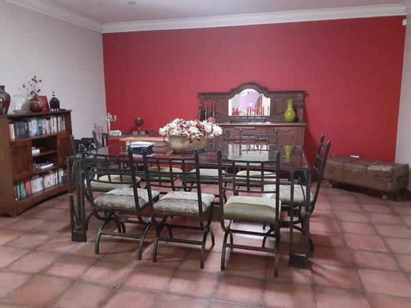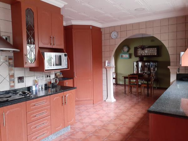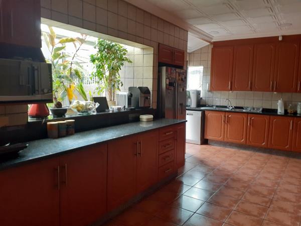 The interior features two generous lounges, a dedicated dining room, and a family TV room, providing ample space for relaxation and entertainment. The well-appointed kitchen offers warm-toned wooden cabinetry, black countertops, and terracotta-colored tiled flooring, complemented by modern appliances and a convenient pantry. An inviting built-in bar and a cozy fireplace add to the home''s appeal, perfect for social gatherings.