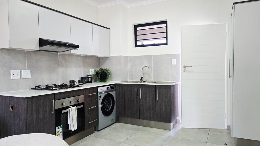 The kitchen is a modern showpiece featuring granite countertops, a gas hob, and built-in cupboards, flowing seamlessly into an open-plan living area that leads out to a private balcony or patio, perfect for relaxed living and entertaining.