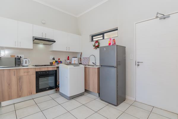 - Modern kitchen with built-in cupboards, sleek countertops, 4 plate stove, extractor, under counter oven and space for your front loader and dishwasher machines