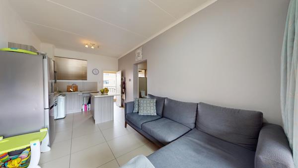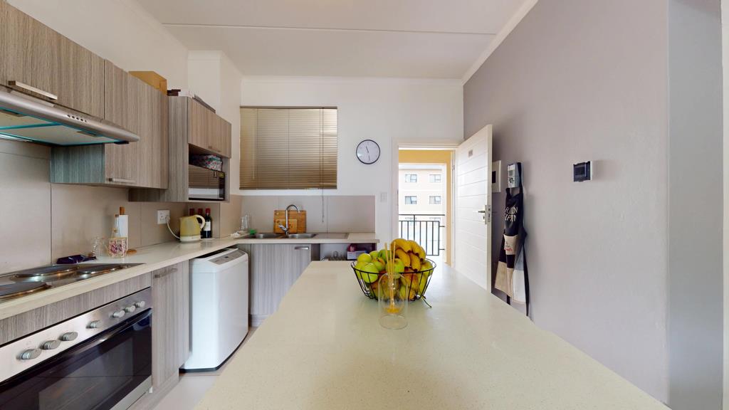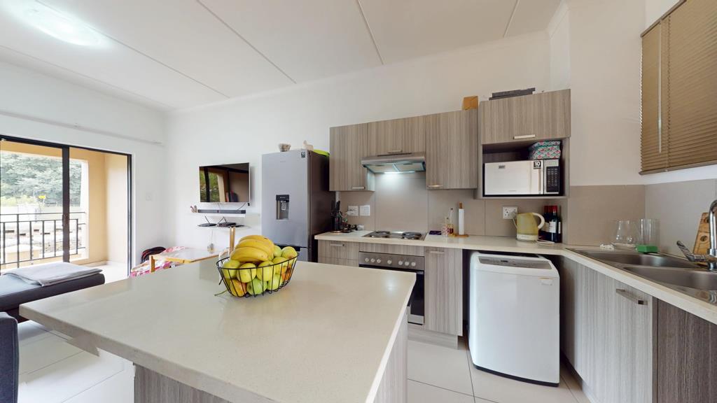 The open-plan living space is modern throughout, featuring a stylish kitchen with a large island and elegant engineered stone countertops. The lounge flows effortlessly onto a private balcony through sliding doorsan inviting space to enjoy your morning coffee.