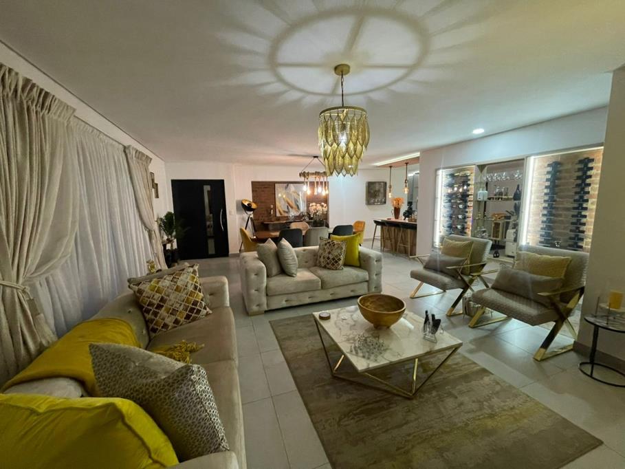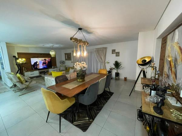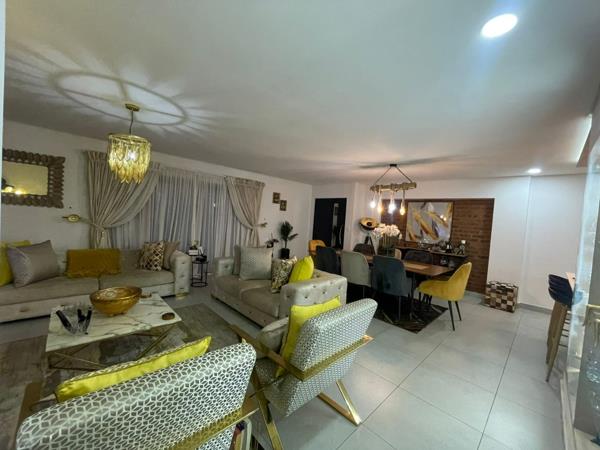 Discover modern living in this exquisite 3-bedroom residence, perfectly situated within a secure estate in Dayanglen, Boksburg. The home welcomes you with an inviting open-plan layout, seamlessly connecting the lounge, dining area, and a stylish kitchen area. Contemporary design elements are evident throughout, featuring a cohesive palette of neutral tones accented by sophisticated gold and yellow touches. Unique decorative lighting fixtures illuminate the space, complementing the characterful brick accent wall. The living areas boast elegant tiled flooring and include a dedicated wine storage and display, ideal for entertaining guests.