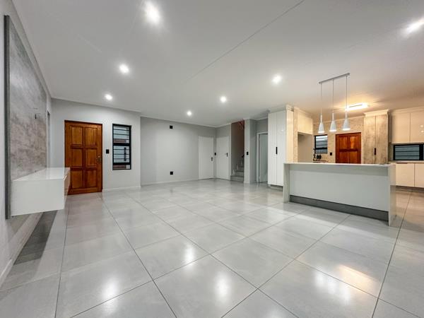 Spacious, open-plan lounge, dining, and kitchen area, fully tiled for easy maintenance.