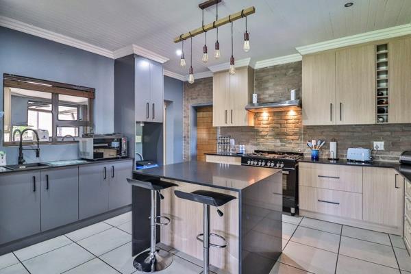The captivating and spacious kitchen with light wood cupboards and Caesarstone countertops is well-planned, with ample convenient work areas in mind. The chef of the family will be in heaven with the gas stove. The scullery and laundry area will make your everyday chores a breeze.