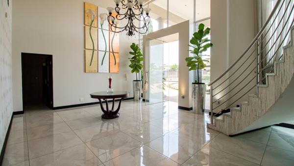 The ground floor also boasts two expansive entertainment areas. One features a fully fitted bar and a beautiful oval glass seating area looking over the expansive lush gardens. The second entertainment space is a true haven with high wooden ceilings and a braii area that opens to the outdoor gardens, perfect for the most lavish parties.