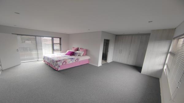 The property features 3 spacious bedrooms and 2 bathrooms, all designed with neat carpeting and built-in cupboards. The main bedroom boasts an en-suite bathroom and a private balcony, providing both comfort and privacy. The open-plan kitchen and lounge area are designed for modern living, complete with a walk-in washroom. The lounge area features two sliding doors that lead directly to the backyard, which includes a built-in braai area and ample space for future expansion.