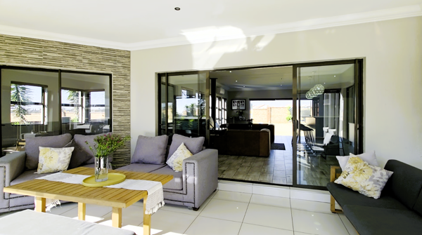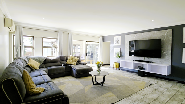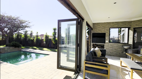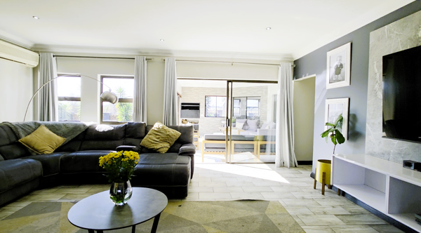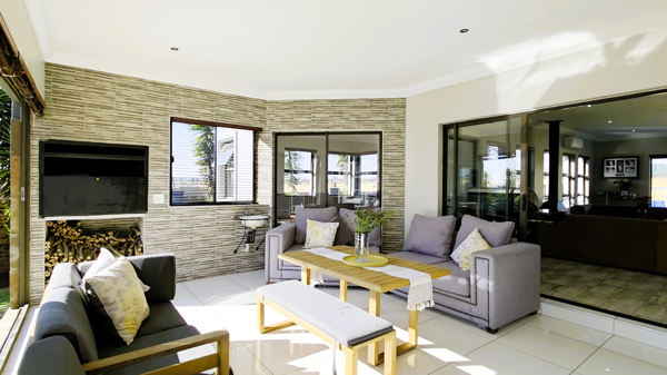 In the enclosed entertainment space, you will find a built-in bar area with stacker doors that open wide allowing the fresh air to come in if you want to host a game day. For cosy evenings, the entertainment space also has a built-in fireplace. Adding further to the grand space is the 10-seater Jacuzzi that can be found behind sliding doors. Connecting the entertainment room is the outdoor seating area with a built-in braai that has its own stacker doors that open wide into the gardens leading into the outdoor pool area in the centre of the home.
