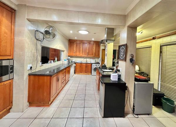 The heart of the home is the spacious kitchen, which features tiled floors and walls, complemented by beautiful wooden cupboards. Home chefs will appreciate the 5-plate gas stove with an extractor fan, granite countertops, and a convenient dishwasher connecting point. A serving hatch opens to the lounge, making entertaining a breeze.