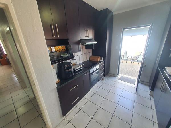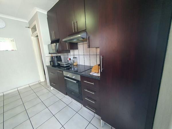 Well planned kitchen with beautiful dark wood cupboards that opens onto a lovely braai area and patio for entertaining family and friends.