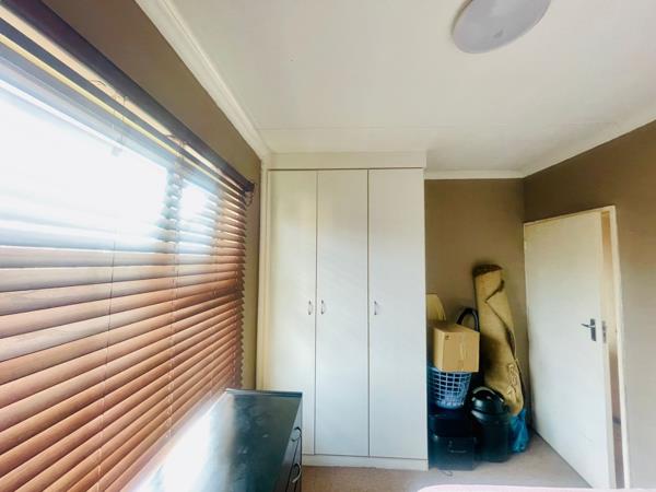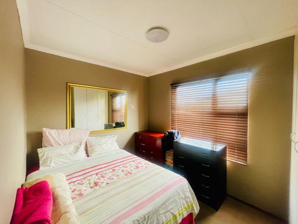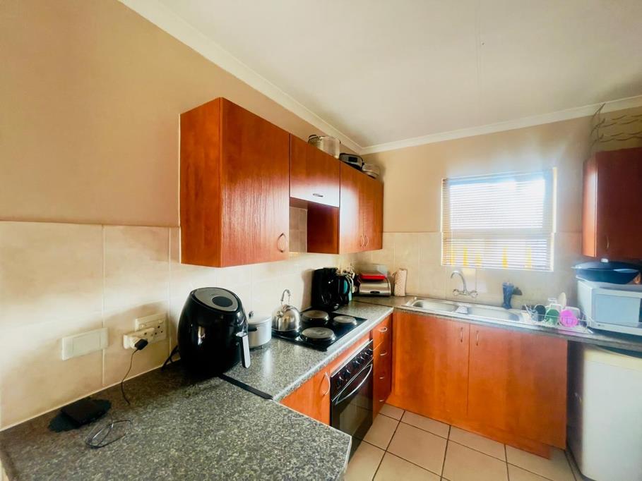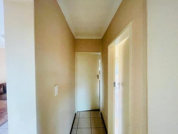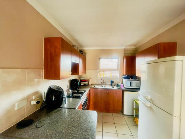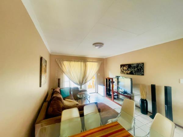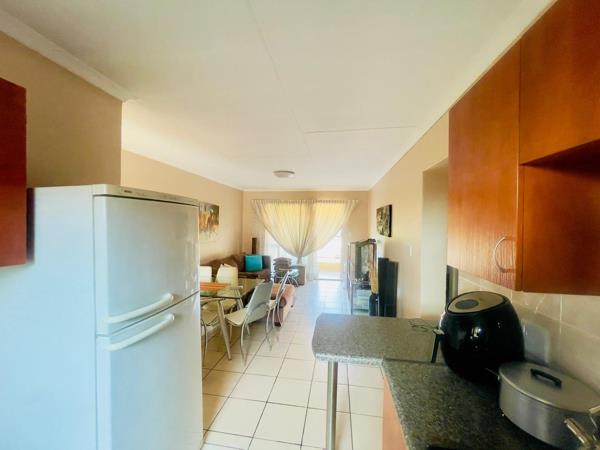 Discover this inviting 2-bedroom, 1-bathroom apartment situated within a well-maintained security complex. The interior boasts an open-plan layout, seamlessly connecting the functional kitchen, dining, and lounge areas. The kitchen features practical wooden cabinetry, speckled countertops, and an integrated ovenstove, providing ample storage and preparation space. Tiled flooring extends throughout the main living areas, ensuring easy maintenance and a cohesive flow. Natural light floods the space through large windows, creating a bright and welcoming atmosphere.