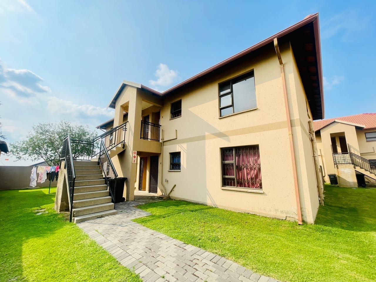 The property is part of a multi-unit building with a neat, light beige exterior and a well-kept lawn, contributing to its appealing kerb side presence. Residents benefit from two dedicated parking bays. The estate environment ensures a community feel, while the presence of security bars on ground-floor windows adds an extra layer of safety.