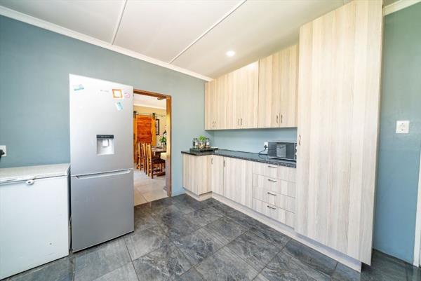 A well-appointed kitchen is conveniently located near the dining room, creating an ideal flow for family meals and gatherings. The property includes three comfortable bedrooms, each fitted with built-in cupboards, and two neatly designed bathrooms to accommodate the household. Parking is ample with a double garage and a two-car carport, ensuring secure space for vehicles.