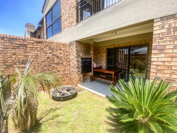 The apartment features two spacious bedrooms, one modern bathroom, and tiled living areas that open up onto a lovely patio with views of a neat, landscaped garden. The open-plan granite kitchen is well-equipped with space for two appliances and plenty of cupboard storage.