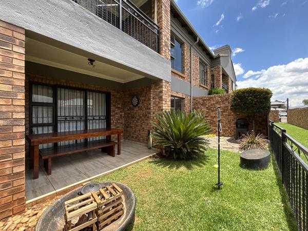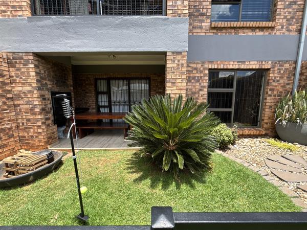 The open-plan living area flows seamlessly onto a private patio with built-in braai, overlooking a private garden perfect for entertaining or relaxed outdoor living. The complex is well managed and offers excellent lifestyle features including a swimming pool and generator backup, ensuring peace of mind during power outages.