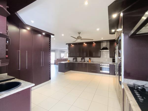The spacious modern kitchen provides endless cupboards and plenty of work space on the beautiful granite tops. Featuring 2 ovens, a gas hob and ceiling-to-floor grocery cupboards strategically designed for extra packing space, perfect for a large, hungry family! The kitchen flows onto a unique separate glass-walled scullery consumed with natural lighting.