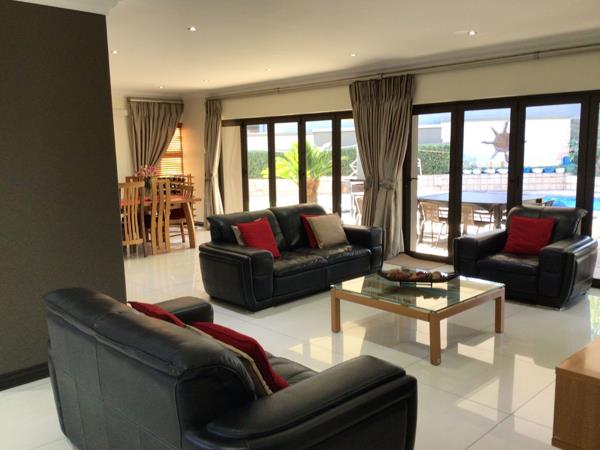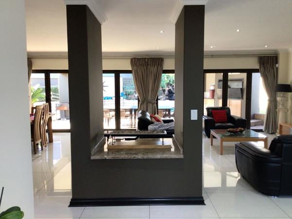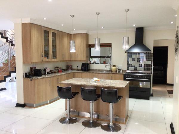 A long driveway leading to a double garage with automated doors, as you walk into this beautiful house you are welcomed by a double-volume entrance with a lovely gas fireplace. Just behind the fireplace is a large open-plan lounge and dining room which leads right into the spacious kitchen with granite tops and a gas stove.