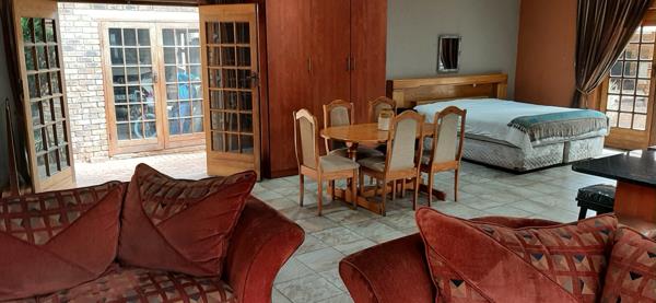 Open plan, with kitchenette, bathroom with shower, walk in cupboard,& patio.
