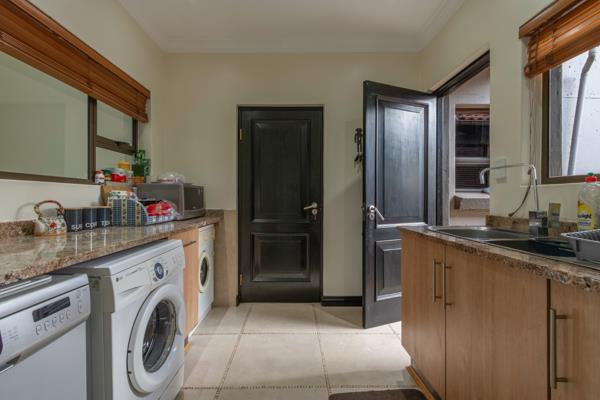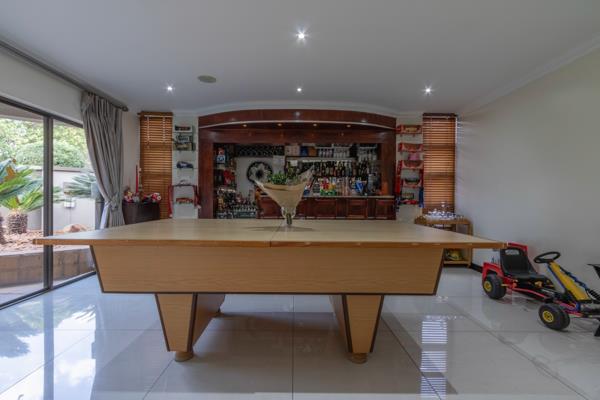 The kitchen is perfect for entertaining, with ample space for food preparation and socializing. The adjacent braai area and pool create an ideal setting for relaxing with family and friends.