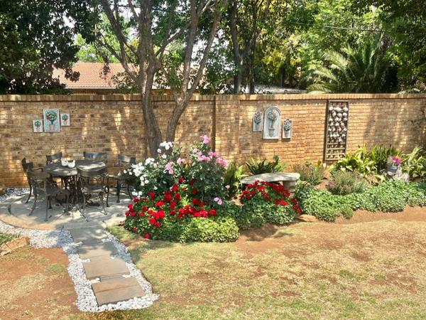 The beautifully landscaped private garden is an oasis of relaxation, featuring a boma and a covered patio with canvas sides. A built-in braai and sliding door open onto the back garden, perfect for outdoor entertaining.