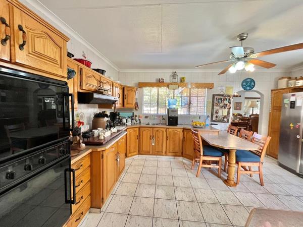 Culinary enthusiasts will adore the large kitchen, which comes equipped with wooden cupboards, a breakfast nook, melamine countertops, and tiled floor and walls. It hosts a four-plate electric stove, a double eye-level oven, as well as a five-plate gas stove with a gas oven. For added convenience, the separate scullery offers connection points for a dishwasher and washing machine, a double basin, and a walk-in pantry with ample shelving.