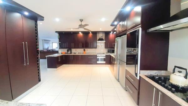 The large open-plan living areas provide a perfect setting for relaxation and entertaining, seamlessly blending with a generously sized kitchen. This culinary haven features stunning granite counter-tops, ample cupboard space, gas and electric hobs, 3 ovens, and a separate scullery for added convenience.