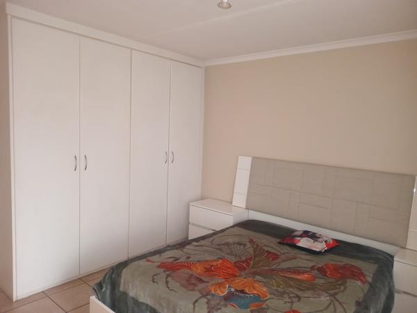Here is a two bedroom apartment on the first floor of a block of apartments at the end of a secure complex in Van Dyk Park , Boksburg. A flight of stairs, to keep you fit, will take you to the well fitted kitchen that boasts of an electric hob, extractor, plenty cup boards, and space for washing machine. The lounge is spacious with a back door that leads to a spacious balcony that offers a good view. The balcony has a covered braai area that helps build up an excellent entertainment area. The main bedroom has massive closets and can fit in a queen sized bed. All the rooms are tiled for ease of cleaning.