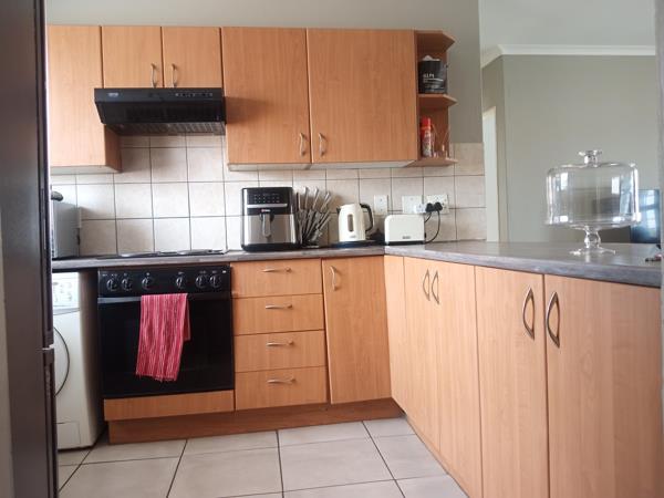 The full bathroom includes both a shower and a bathtub ideal for relaxing after a long day or for busy mornings. The kitchen is a standout, beautifully designed with plenty of cupboard space, perfect for those who love to cook and entertain. The large, open-plan lounge area flows effortlessly onto a spacious patio equipped with a built-in braai a perfect space for hosting family and friends.