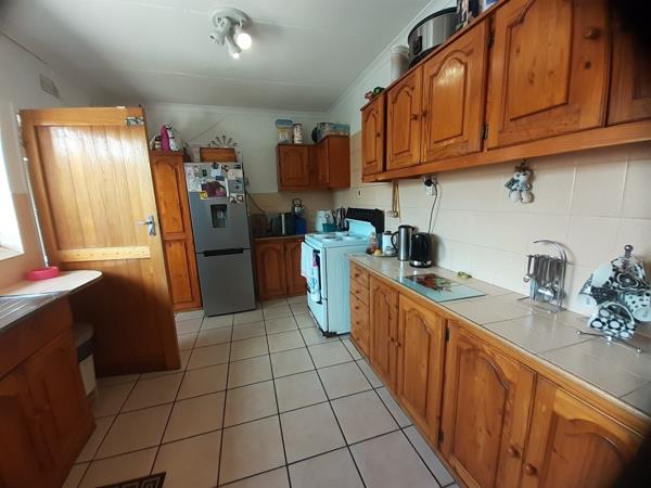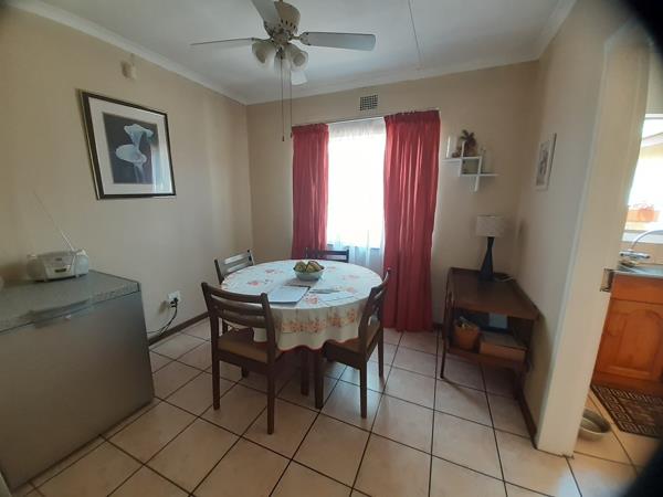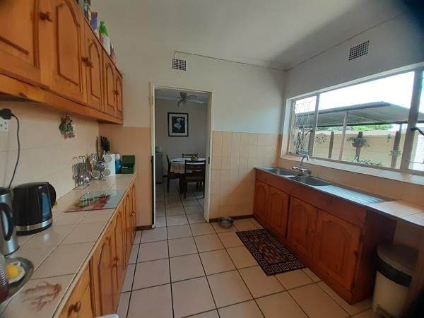 Inside, the residence offers spacious living areas designed for comfort. The sunlit lounge features durable tiled flooring, a functional fireplace, and a ceiling fan, with large windows offering pleasant garden views. An adjacent dining area, also tiled and equipped with a ceiling fan, connects seamlessly to the kitchen. The kitchen provides ample wooden cabinetry, countertops, a double sink, and a large window for natural light, catering to all your culinary needs.