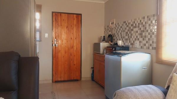 The house features a sleek, contemporary design with two cozy bedrooms and a well-appointed bathroom. The open-plan layout seamlessly connects the kitchen and sitting area, creating a welcoming space for relaxation and entertainment. Securely positioned within a gated community with guarded access, this home ensures safety and privacy.