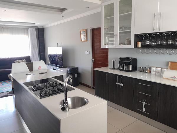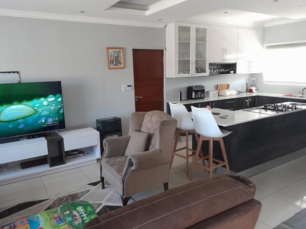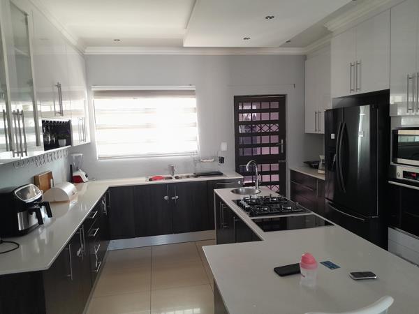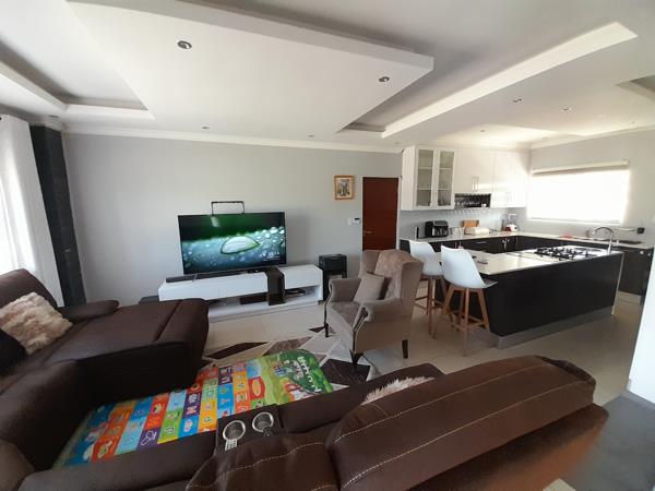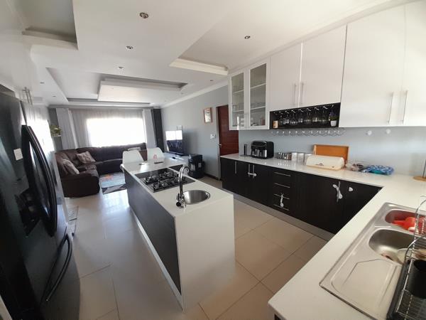 Luxurious 4-bedroom home with 2,5 bathrooms, including a main en-suite with a walk-in closet. This property offers an open-plan kitchen, dining, and lounge. It has modern touches consisting of a built-in stove on an island with white granite tops. The high ceilings allow for natural light and ventilation. The bedrooms are spacious with ample storage and space.