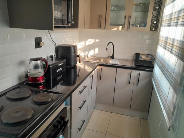 The kitchen is fitted with granite tops for a sleek, modern look. Blinds in the kitchen allow for precise control over natural light, adding to the overall ambiance. There is a practical bathroom layout featuring a shower, toilet, and washing machine connection. An electric gate motor ensures secure and effortless access to the property.