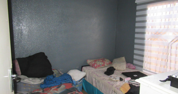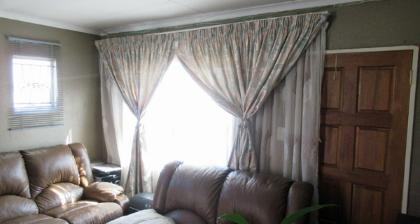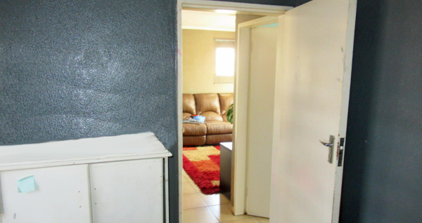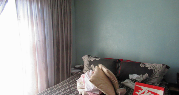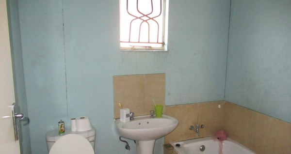 Accommodation includes two bedrooms, each offering natural light. The main bedroom features light blue walls and full-length curtains, while the second bedroom has modern venetian blinds. A single bathroom is equipped with a toilet, pedestal sink, and bathtub, with a window for ventilation. Security bars on some windows provide added peace of mind.