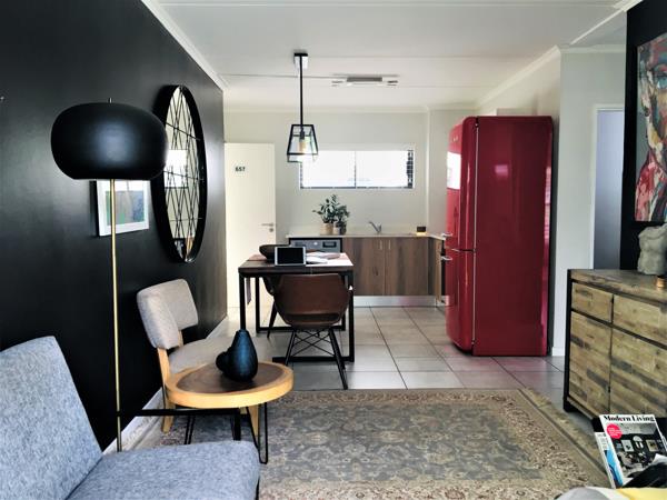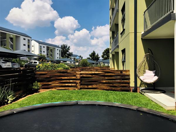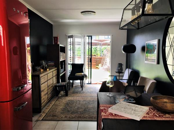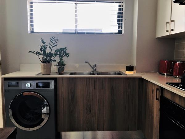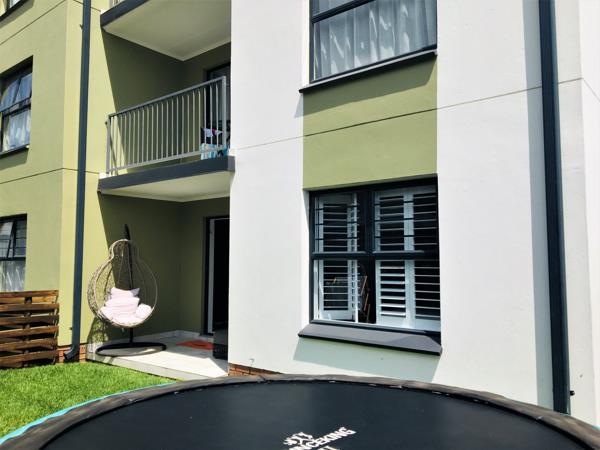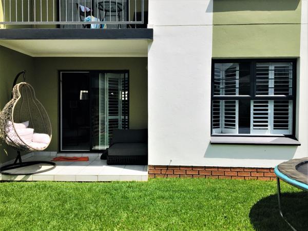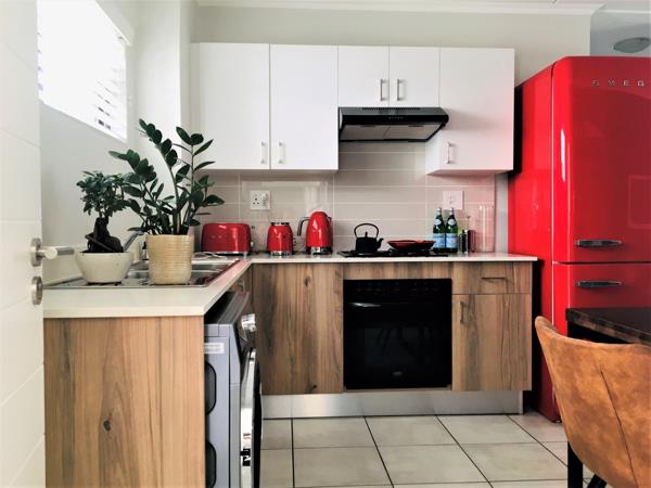 Ground floor, north-west facing, apartment offers the perfect lock up and go experience. Front door opens into the spacious, open plan kitchen featuring modern lighting, white quartz Caesar stone countertops, double sink, space for fridge and under counter washing machine, Defy 600 electric counter top hob, under counter oven, extractor fan and built in cupboards with extra storage space above. Lounge is light and sunny, boasting French shutters and sliding door onto the patio and large enclosed garden. Main bedroom presents picture window, built in cupboards, French shutters and views of the garden. En-suite bathroom sports glass encased shower, medicine cabinet, toilet and wall hung basin. Second bedroom basks in afternoon sun, has built in cupboards and a smaller higher window for that extra privacy. Second bathroom incorporates glass encased shower, medicine cabinet, wall hung basin and toilet.