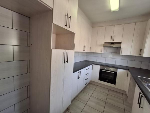 The spacious kitchen is a true highlight, fully tiled to the ceiling and boasting an abundance of modern built-in cupboards. It is well designed with space for a tall single-door fridge and microwave, as well as plumbing and electrical points for a dishwasher. A quality under-counter oven, thermal 4-plate hob, and electric extractor fan complete the modern cooking space, while a durable aluminium twin-tub wash-up sink adds practicality.