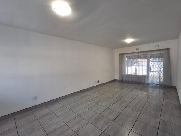 The open-plan dining room and lounge are light-filled and inviting, with sleek tiled floors and a charming French glass door that opens onto a private tiled patio overlooking a neat, pet-friendly garden the perfect space to relax or entertain.
