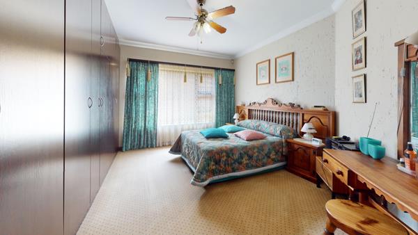 Inside, this home boasts three generously sized bedrooms, all basking in natural light and fitted with stunning floor-to-ceiling cherrywood cupboards. The main bedroom is particularly spacious, offering an abundance of cupboard space from wall to wall. It features a private en-suite bathroom, fully tiled for a sleek and modern finish.