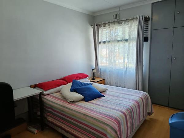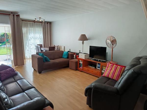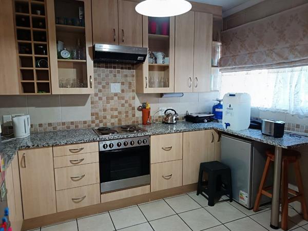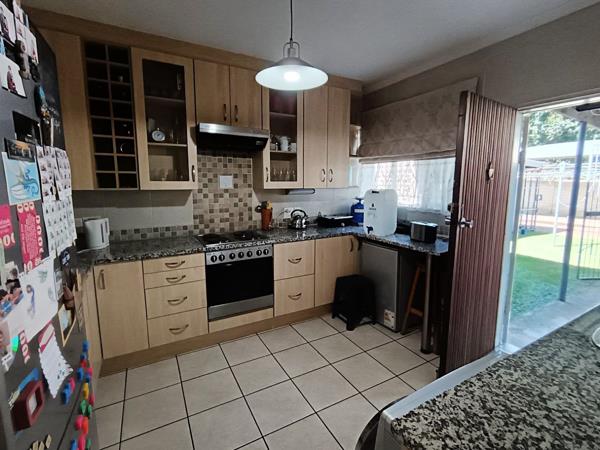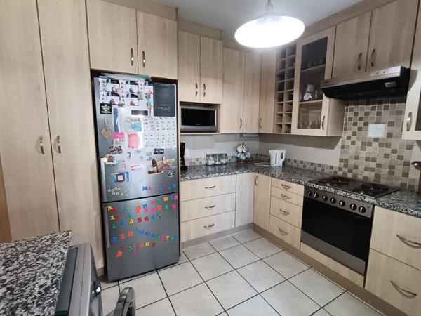 The home features a private, pet-friendly garden ideal for outdoor living and relaxation. The spacious open-plan lounge and dining area is enhanced by laminated flooring throughout, creating a warm and inviting atmosphere. The contemporary kitchen includes light wood-wrapped cabinetry, granite countertops, ample storage space, and elegant display cabinets. It opens onto a private courtyard, where undercover parking is conveniently located directly adjacent to the unit. An additional shade-net parking bay is also included. A guest cloakroom is provided downstairs for added convenience.