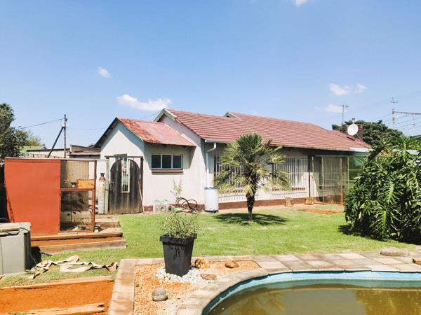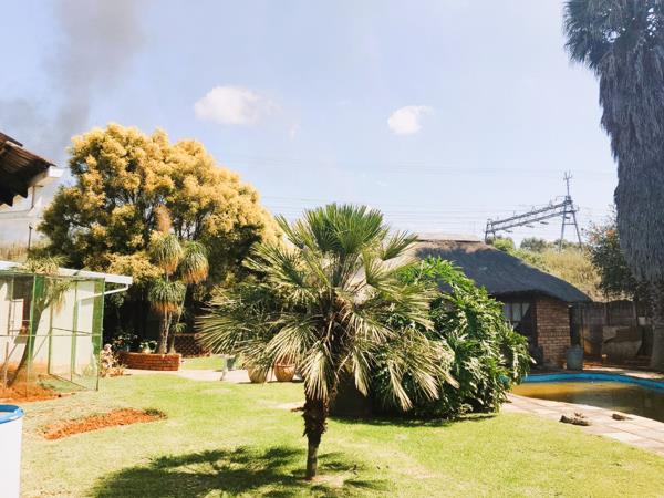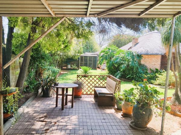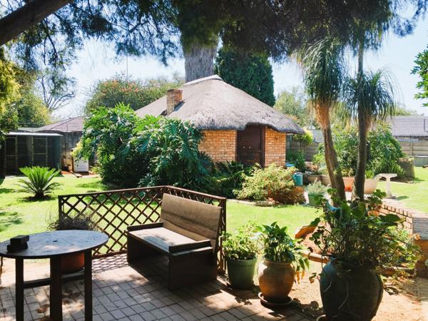 Outdoor living is a highlight of the property, with a lapa thatched entertainment area overlooking a swimming pool, perfect for hosting guests or enjoying warm days. The landscaped garden enhances the overall appeal, creating a serene and visually pleasing environment.
