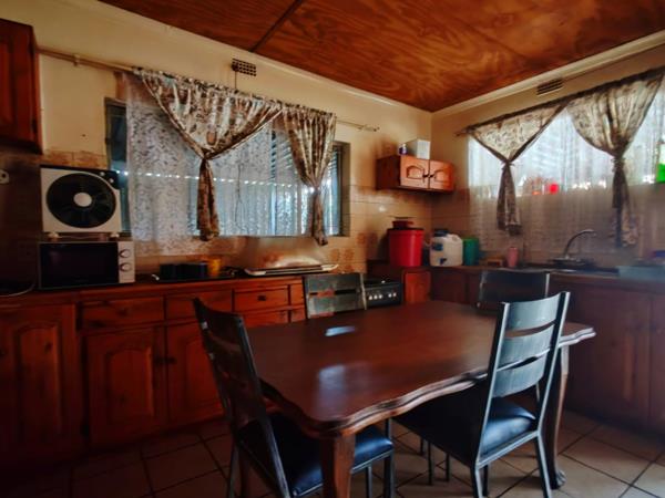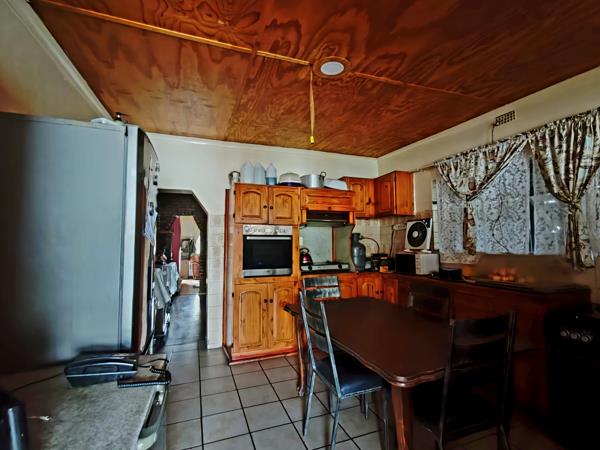 The kitchen is spacious and includes a wall-fitted oven. Outside, there is a flatlet with a kitchen, sitting area, and a bedroom with a bath. The house also boasts a garage that can easily park six large vehicles inside, plus an open parking area with a covered roof that can accommodate another 3 vehicles. There is also a +/- 15 square meter workshop joined to the garage and the flatlet.