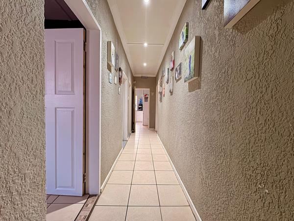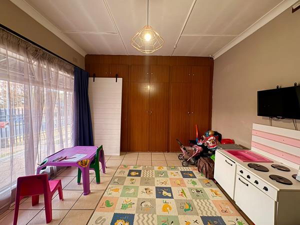 The property boasts four spacious bedrooms with built-in cupboards, two bathrooms with a main en-suite, a sunny lounge adjacent to a sunroom, kiddies playroom/study, a fitted kitchen, and a built-in braai area with undercover patio.