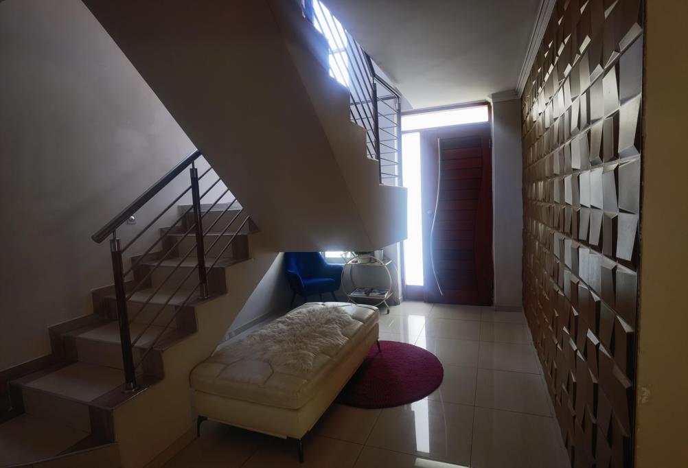 Ascending to the upper level, a sumptuous family living room awaits, providing a tranquil retreat for relaxation or recreation. Adjacent is another multipurpose room, complete with a balcony, perfect for indulging in panoramic views or basking in the gentle caress of the evening breeze. A stylishly appointed bathroom serves the upper level, catering to the needs of family members and guests alike.