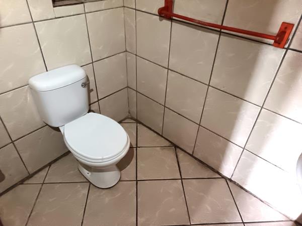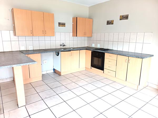 A large linen cupboard in the passage provides additional storage, and the open-plan kitchen and living area creates a welcoming space for entertaining. The kitchen is fitted with oak-finished melamine cupboards, a breakfast bar, electric hob, undercounter oven, and fittings for a washing machine, with space for a fridge. The rest of the unit has tiled flooring, although some areas may require tile replacement reflected in the very reasonable asking price.