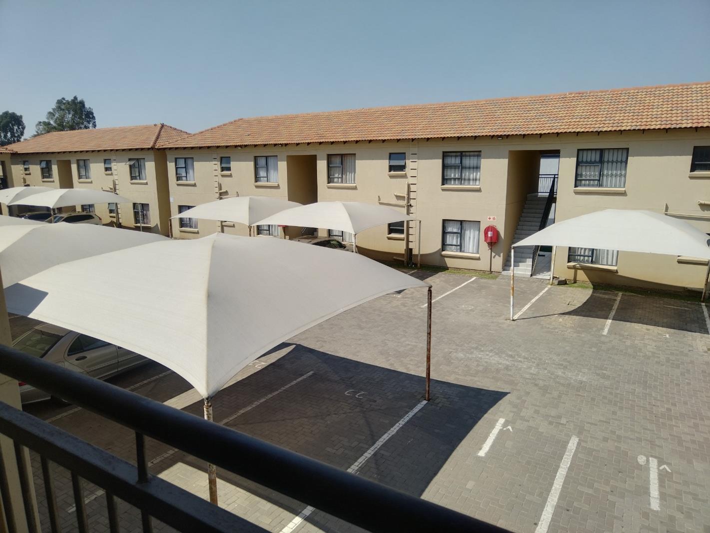 Discover this meticulously presented two-bedroom, one-bathroom corner unit, nestled in a quiet, secure estate in Brakpan North, Oaklane Estate. This spacious 63-square-metre residence forms part of a well-maintained two-story complex with light-colored facades and terracotta tile roofs.