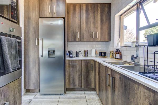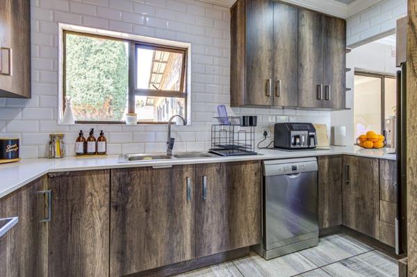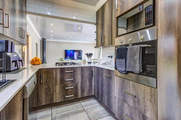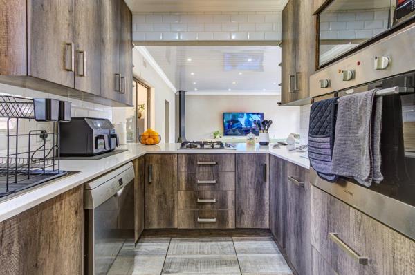 Contemporary finishes: Fully tiled floors, magnificent kitchen with Caesarstone tops, gas hob, and eye-level oven.