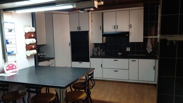Large open plan kitchen with lots of cupboards and scullery / laundry room