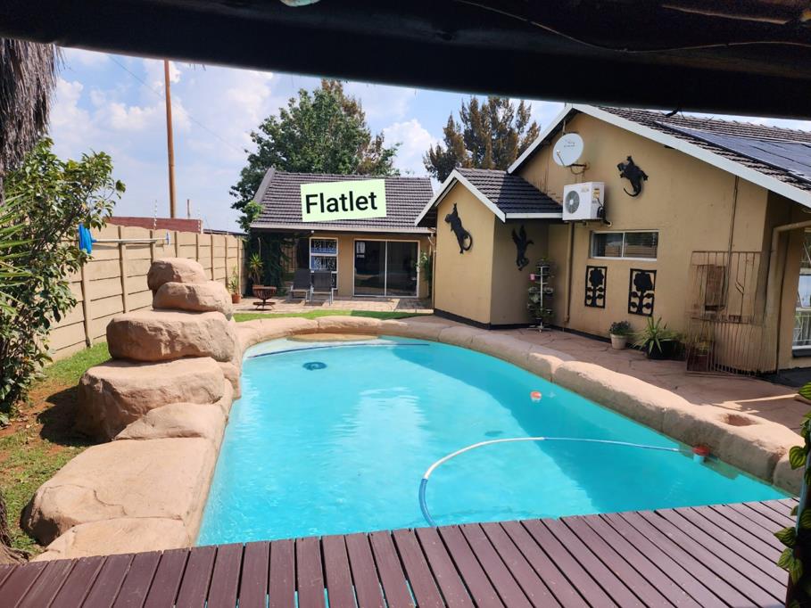 The flatlet fully tiled two-bedroom flat with gas stove and gas geyser. Sliding doors from the pool side will lead you into a huge lounge / dining room area.