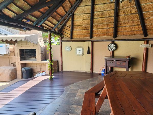 Next to the tv room you will find one of the guest toilets and the fireplace. Next to the dining room you will find the indoor braai area. In this room you will also find the pizza over, tv and jacuzzi with sliding doors that leads to the very inviting back yard.