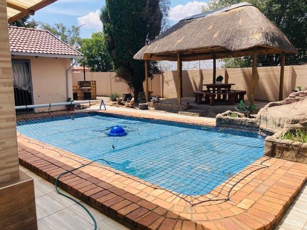 Spacious living area with 4 lounges and dining areas with a cosy double sided fir place. Open plan to large modern kitchen inter-leading entertainment area with an indoor which takes you to the pool area with a built in braai stand and a lapa. Massive main bedroom is equipped with a large built ins an an en-suite, an office and an indoor gym. The property has 3 modern spacious kitchens. It has 3 flatlets that can be used for rentals. The property is fully enclosed with access control via an automatic gate system and double automatic garage. Garden is completely enclosed, providing a safe play area for children and pets alike.