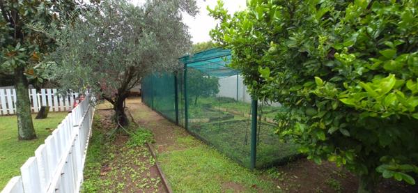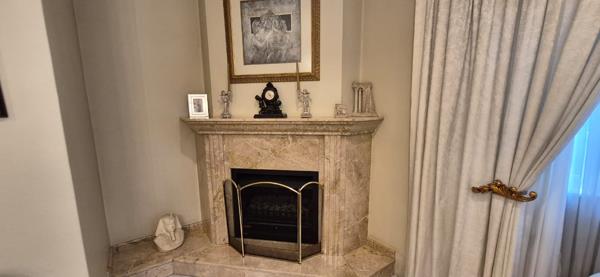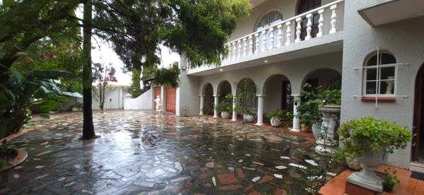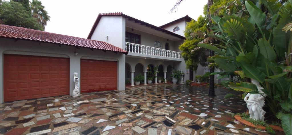 Most of the living areas open via double sliding doors to a generous covered patio equipped with a built-in gas braai, offering a picturesque view of the stunning garden and pool.