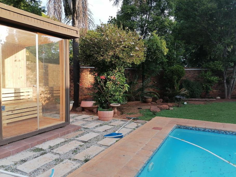 The outdoor spaces are a true highlight, set on a generous 1375 sqm erf. Enjoy a private oasis featuring a refreshing swimming pool, perfect for leisure and recreation. Adding a touch of luxury, a private outdoor sauna cabin provides a serene escape. Mature trees and an established garden create a tranquil environment, with paved pathways connecting these desirable amenities, all enclosed by a brick wall for enhanced privacy.
