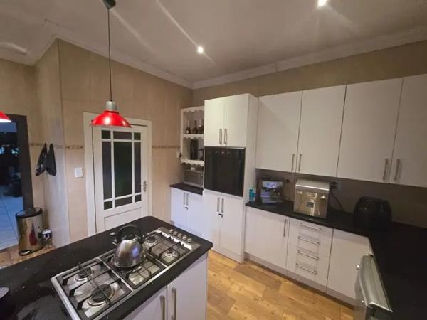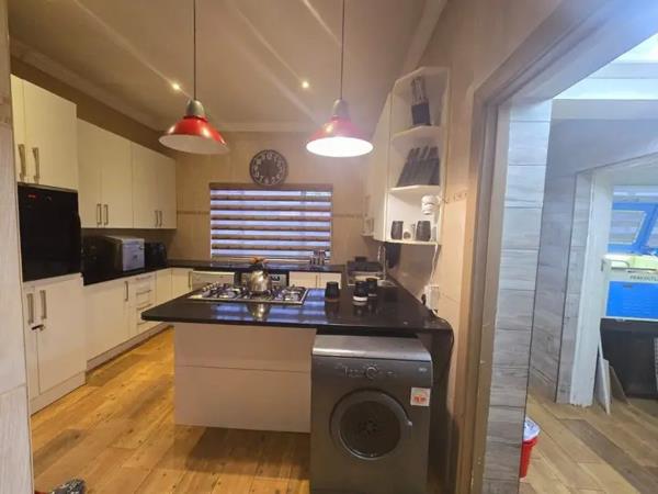 Step inside to discover a thoughtfully designed interior, boasting a generous 399 sqm floor size. The property features two modern kitchens, a significant advantage for dual living arrangements or extended families. Each kitchen is equipped with sleek white cabinetry, contrasting black countertops, and warm wood-look flooring. Highlights include a central island , integrated oven, and stylish red pendant lighting, offering both functionality and contemporary appeal. A comfortable lounge provides ample space for relaxation and entertaining.